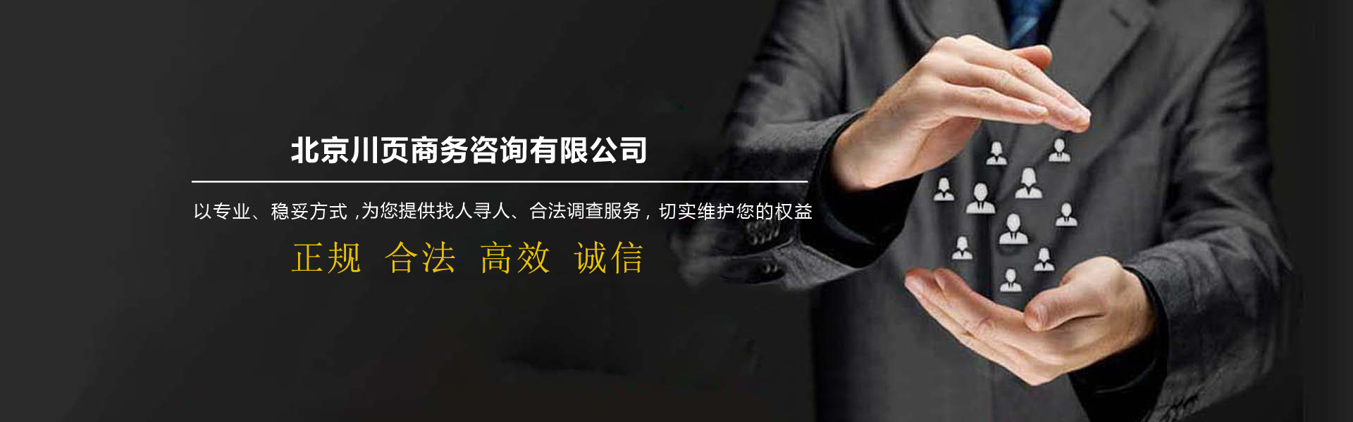 北京市偵探公司-北京川頁商務(wù)咨詢有限公司是面向全國提供找人尋人服務(wù)平臺,公司致力于為企業(yè)、個人解決發(fā)展中各類債務(wù)問題、債權(quán)訴訟、債權(quán)轉(zhuǎn)讓事務(wù),幫助快速尋找親人、朋友、戀人、戰(zhàn)友等找人服務(wù),以及婚姻家庭情感咨詢等業(yè)務(wù)。公司擁有一批律師,商賬管理師專業(yè)的工作人員,依托互聯(lián)網(wǎng)平臺,在國內(nèi)形成了完善的調(diào)查尋人服務(wù)網(wǎng)絡(luò),業(yè)務(wù)范圍已經(jīng)逐漸覆蓋北京及全國各大主要城市和地區(qū)。我們始終秉承"捍衛(wèi)真理、堅持誠信、以人為本、奉獻社會"的服務(wù)理念和"專業(yè)、創(chuàng)新、和諧、共贏"的經(jīng)營理念,我們希望通過提供全面、及時、準(zhǔn)確、專業(yè)的相關(guān)信息,以優(yōu)質(zhì)的服務(wù),專業(yè)的技巧,為各位有需求的人員提供服務(wù)!